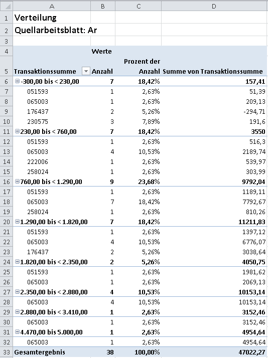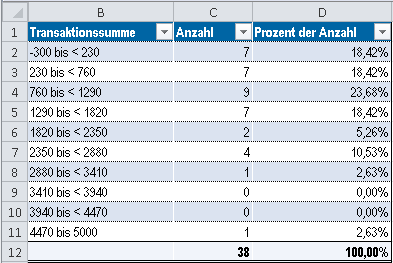 Sie arbeiten mit einer Forderungentabelle und benötigen die Anzahl der Transaktionen je Summenintervall. Hierzu verteilen Sie die Daten mit Hilfe Transaktionssummenspalte und bilden eine Zwischensumme für die Transaktionssummenspalte.
