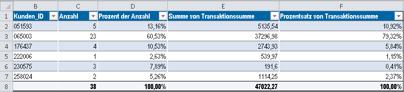In Ihren Ergebnissen finden Sie Gesamtzahl der Transaktionen je Kunde sowie die Gesamttransaktionssumme je Kunde.