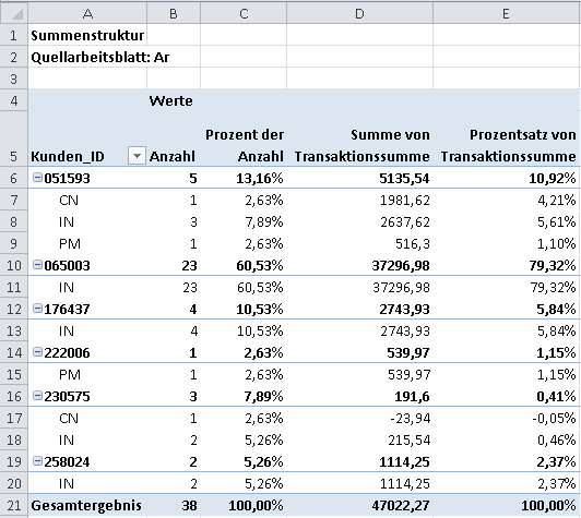 Sie arbeiten mit einer Forderungstabelle und benötigen die Anzahl für der Transaktionen für jeden Transaktionstyp je Kunde. Hierzu bilden Sie eine Summenstruktur für die Spalten Kunden-ID und Transaktionstyp und bilden dann eine Zwischensumme für die Spalte des Transaktionsbetrags.