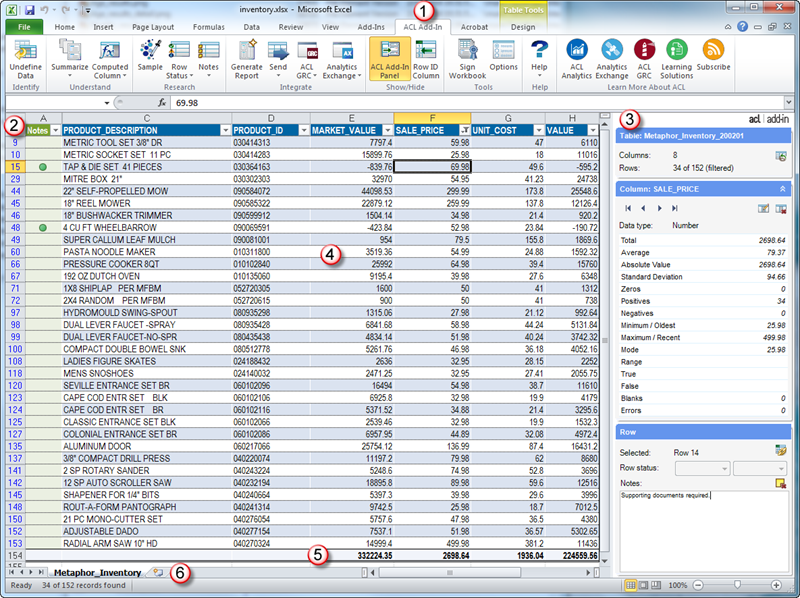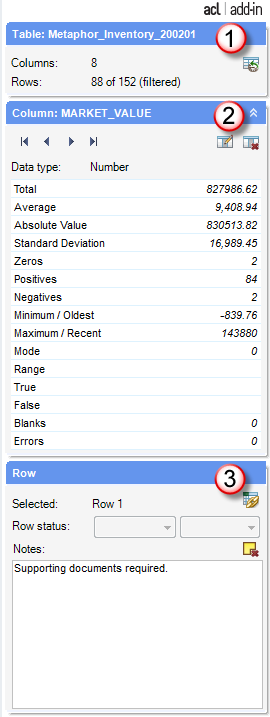 | 3 | ACL Add-In panel | Displays details about the active Add-In for Excel table and allows you to perform additional functions. For more information, see The ACL Add-In panel. |