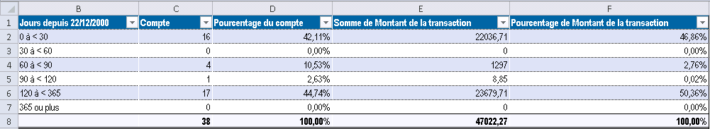 Dans vos résultats, vous voyez le nombre total de transactions par période d'antériorité, regroupées par client, et le montant total des transactions par période et par client chaque période.