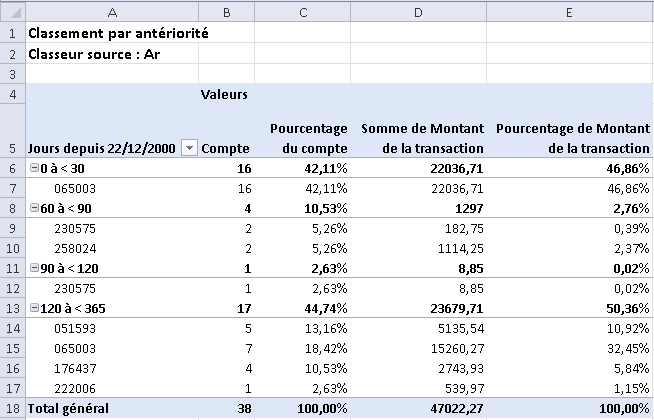Si vous sortez les résultats du classement par antériorité vers un tableau croisé dynamique ou vers un graphique croisé dynamique, vous pouvez regrouper les périodes d'antériorité en fonction des valeurs dans des colonnes supplémentaires.