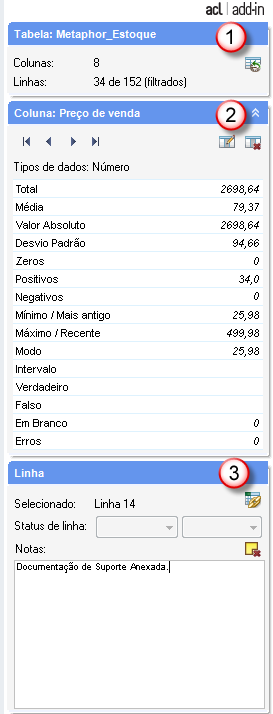| 3 | Painel do ACL Add-In | Exibe detalhes sobre a tabela ativa do Add-in para Excel e permite que você execute funções adicionais. Para obter mais informações, consulte O painel do ACL Add-In. |