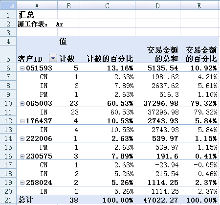 您正在处理应收帐款表,并且您需要找出每个客户的交易总数。为此,您按客户 ID 进行汇总并且小计交易金额列。