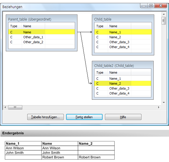 Sie möchten Namen verwenden, um zwei Tabellen zusammenzuführen oder zu verbinden. Die primäre oder übergeordnete Tabelle enthält das Feld Name. Die sekundäre oder untergeordnete Tabelle enthält jedoch zwei unterschiedliche Namensfelder – Name_1 und Name_2. Übereinstimmende Namen in der sekundären oder untergeordneten Tabelle könnten in jedem der zwei Namensfelder erscheinen.