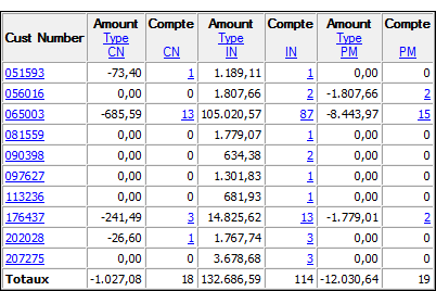 - tabulation croisée entre le numéro client et le type de transaction dans une table Comptes clients