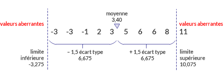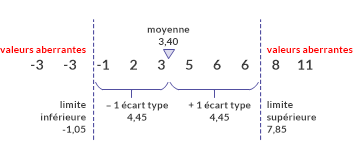 Dans le premier exemple, vous utilisez la moyenne ± 1 écart type pour déterminer les limites inférieure et supérieure des valeurs aberrantes. Quatre valeurs sont identifiées comme étant des valeurs aberrantes.