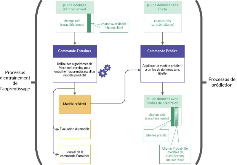 Le flux de travail d'entraînement et de prédiction se compose de deux processus liés, et de deux jeux de données associés :