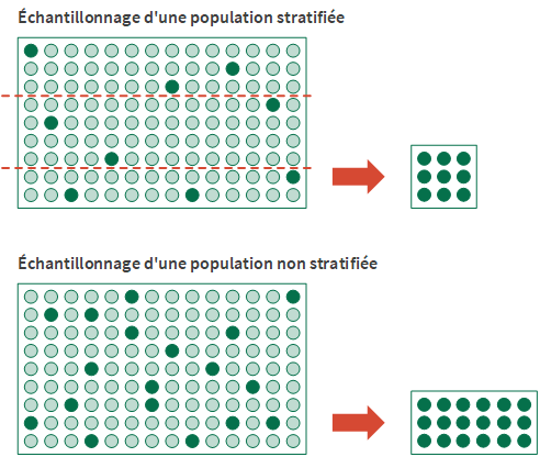 La stratification revient à diviser une population en un certain nombre de sous-groupes, ou niveaux, appelés couches. Idéalement, les valeurs de chaque couche sont relativement homogènes.