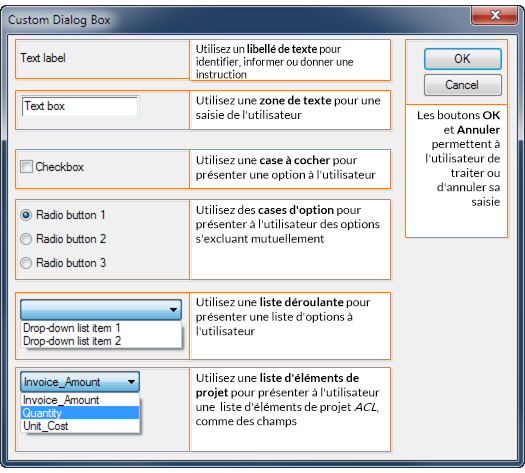 L'exemple de boîte de dialogue personnalisée ci-dessous donne un exemple de chaque type de commande.