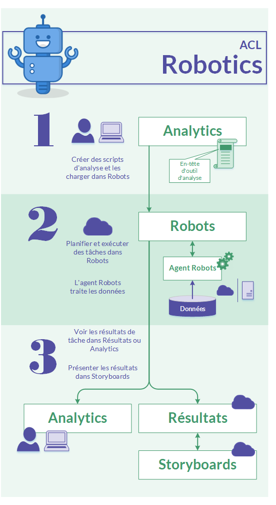 | Automatisation avec Robots | Robots est une application Diligent One grâce à laquelle vous pouvez automatiser des tâches répétitives en utilisant les scripts d'analyse de données intégrés dans Analytics. Robots traite les tâches récurrentes en fonction de votre configuration. |