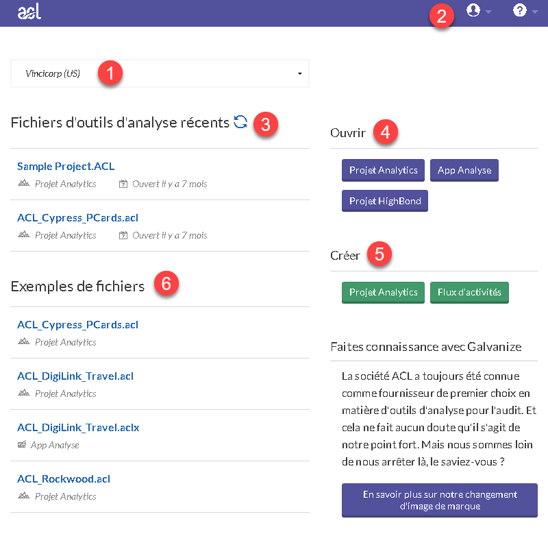 | 6 | Exemples de fichiers | Ouvrez des projets Analytics pré-existants incluant divers exemples de données. |