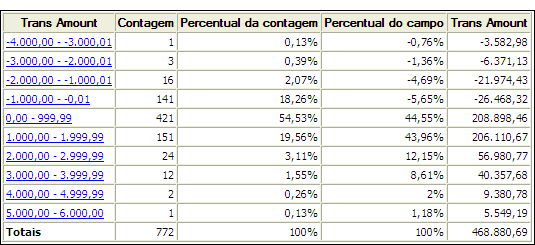 Por exemplo, um campo de valor da fatura em uma tabela de contas a receber poderia ser estratificado em intervalos de US$ 5.000 (faturas de US$ 0 a US$ 4.999,99, de US$ 5.000 a US$ 9.999,99 e assim por diante), e para encontrar a quantidade total de transações e o valor total das transações em cada intervalo.