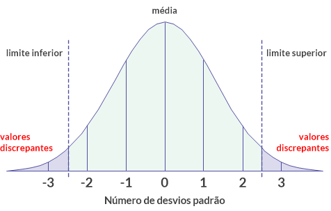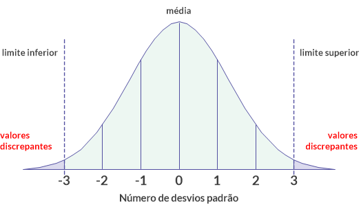 Como os exemplos abaixo mostram, o aumento do múltiplo de desvios padrão desloca os limites superior e inferior dos valores discrepantes para perto das extremidades da curva de distribuição. À medida que os limites se aproximam das extremidades, cada vez menos valores ficam fora desses limites.