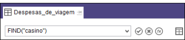 O filtro preenche automaticamente a caixa de texto Filtro, que pode ser modificada, se necessário. Por exemplo, você poderia modificar FIND("casino") para limitar a pesquisa a um campo específico: FIND("casino"; Comerciante).