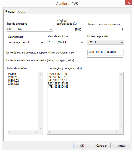 Nível de confiabilidade (%) Número de erros esperados Valor contábil Limites de precisão Limites de camadas População (contagem, valor) Limite de estrato de certeza superior (limite, contagem, valor) |