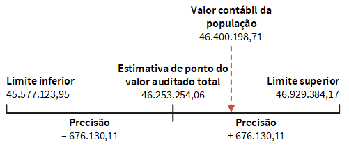 Estimativa de ponto (46.253.254,06) uma projeção estatística do valor auditado mais provável para toda a tabela Faturas Precisão (676.130,11) uma projeção estatística do valor pelo qual a estimativa de ponto pode variar