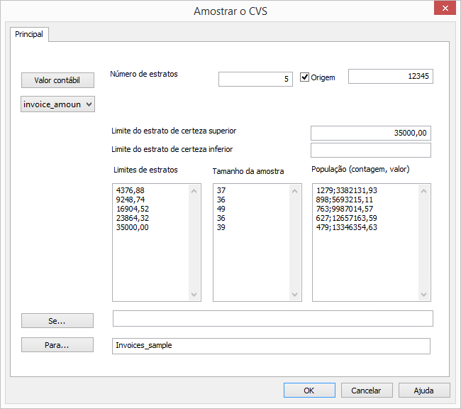 Entradas e resultados da caixa de diálogo Amostrar o CVS