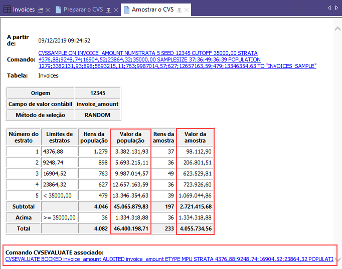 O comando para execução da etapa de Avaliar o CVS, preenchido com valores das etapas de Preparar o CVS e Amostrar o CVS. |