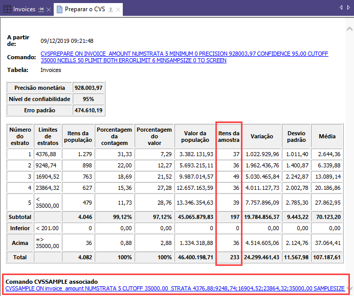 | Valor da população | O valor contábil total da tabela, dividido por estratos, incluindo os estratos de certeza. |