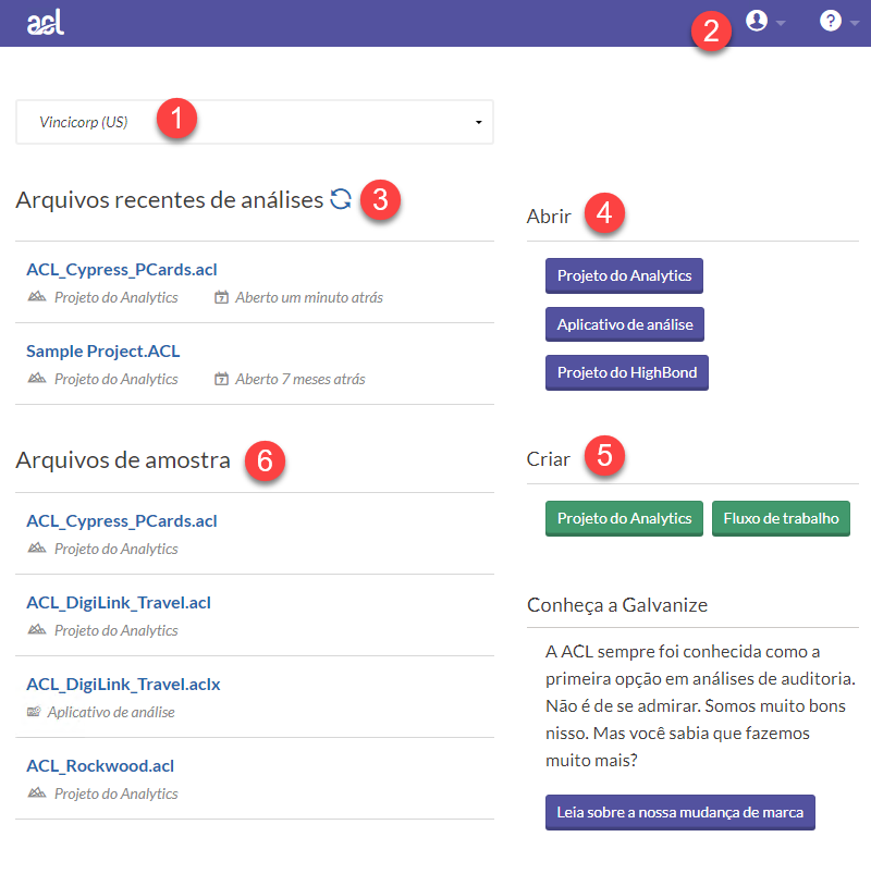 | 6 | Arquivos de amostra | Abra projetos do Analytics predefinidos que incluem diversos dados de amostra. |