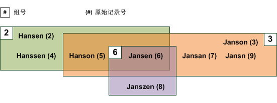 在上述示例中,“Hanson”和“Jansen”一起出现在组 2 和组 3 中。这种情况下,可以同时出现在多个组中,因为差异程度基于各自的组所有者(而不是彼此)进行衡量。 |