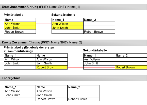 Um alle möglichen Übereinstimmungen zwischen Namen zu erfassen, müssen Sie zwei aufeinanderfolgende Zusammenführungen durchführen, wobei jede Zusammenführung nur eines der Schlüsselfelder in der Sekundärtabelle verwendet. Verwenden Sie die Ausgabetabelle der ersten Zusammenführung als Primärtabelle in der zweiten Zusammenführung.