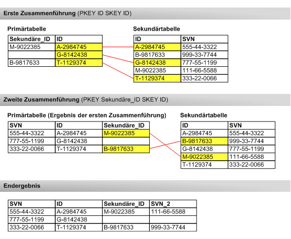 Die primäre oder übergeordnete Tabelle enthält das Feld ID mit den ID-Nummern der Haupt-Steuererklärer und das Feld Sekundäre_ID die ID-Nummern der sekundären Steuererklärer (Gatte/Gattin), falls zutreffend. Die sekundäre oder untergeordnete Tabelle enthält ein ID-Feld mit ID-Nummern für jede Person. Sie können zusammengeführte oder verbundene Daten erzeugen, die Sozialversicherungsnummern sowohl dem Haupt- als auch dem sekundären Steuererklärer zuordnen.