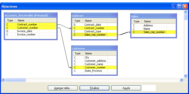 En la figura anterior, la tabla Contrato sirve de tabla intermediaria que relaciona de manera indirecta las tablas Cuentas por cobrar y Ventas. Puede que esté, o no, interesado en los datos de la tabla intermediaria.