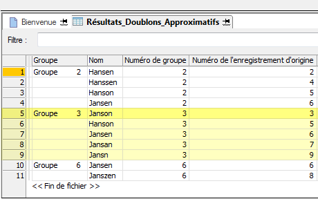 Les résultats de sortie sont organisés en groupes identifiés sous les chiffres 2, 3 et 6. Le Numéro de l'enregistrement d'origine du premier doublon approximatif de chaque groupe permet d'identifier le groupe. Par exemple, Janson est le nom de l'enregistrement numéro 3 de la table d'origine et, comme Janson est également la première valeur du groupe basé sur la séquence d'enregistrement de la table d'origine, le groupe est identifié comme étant le Groupe 3. Pour plus d'informations, consultez la section Regroupement des doublons approximatifs.