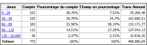 Il compte (sous-totalise) le nombre d'enregistrements de chaque période de classement par antériorité et calcule le pourcentage du nombre total représenté par chaque sous-total. |