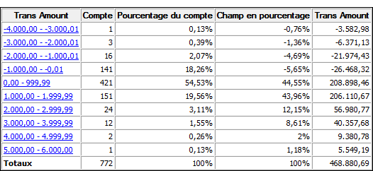 Elle compte (sous-totalise) le nombre d'enregistrements de chaque intervalle, ainsi que le pourcentage du nombre total représenté par chaque sous-total. |