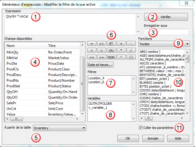 Inclut les variables associées à la table sélectionnée Pour ajouter une entrée de variable à la zone de texte Expression, double-cliquez dessus. |