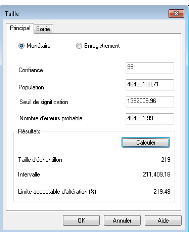- Sélectionnez Échantillonnage > Échantillonnage par enregistrement/unité monétaire > Calculer une taille.