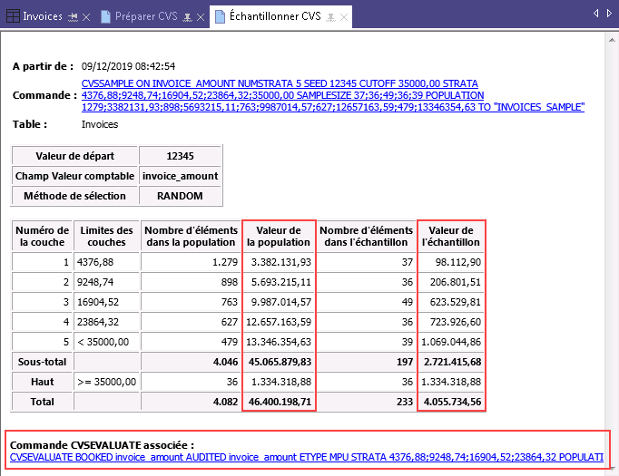 - En bas de la zone d'affichage Échantillonner CVS, cliquez sur le lien CVSEVALUATE pour charger la commande dans la ligne de commande.