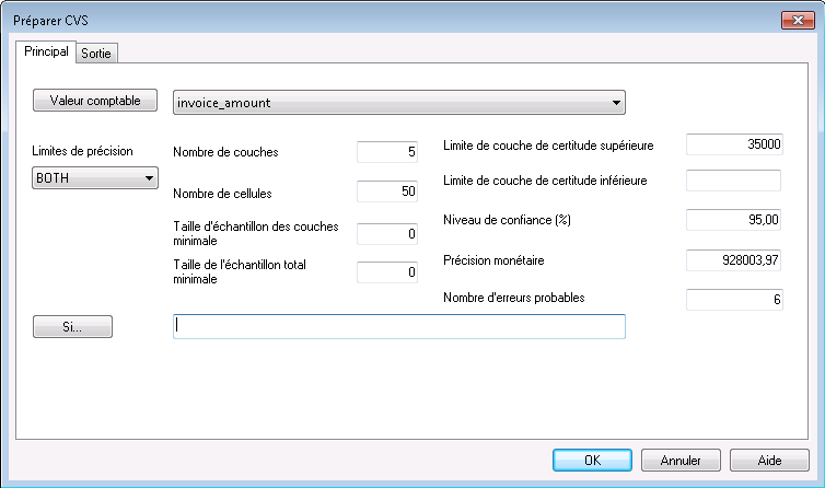 Facultatif. Valeur limite de couche de certitude inférieure. Les montants dans le champ Valeur comptable qui sont inférieurs ou égaux à la valeur limite sont sélectionnés et inclus automatiquement dans l'échantillon. Si vous ne spécifiez pas de valeur limite, une valeur limite par défaut est utilisée pour garantir qu'aucun enregistrement n'est inclus dans la couche de certitude inférieure : inférieur (<) au montant minimal dans le champ Valeur comptable