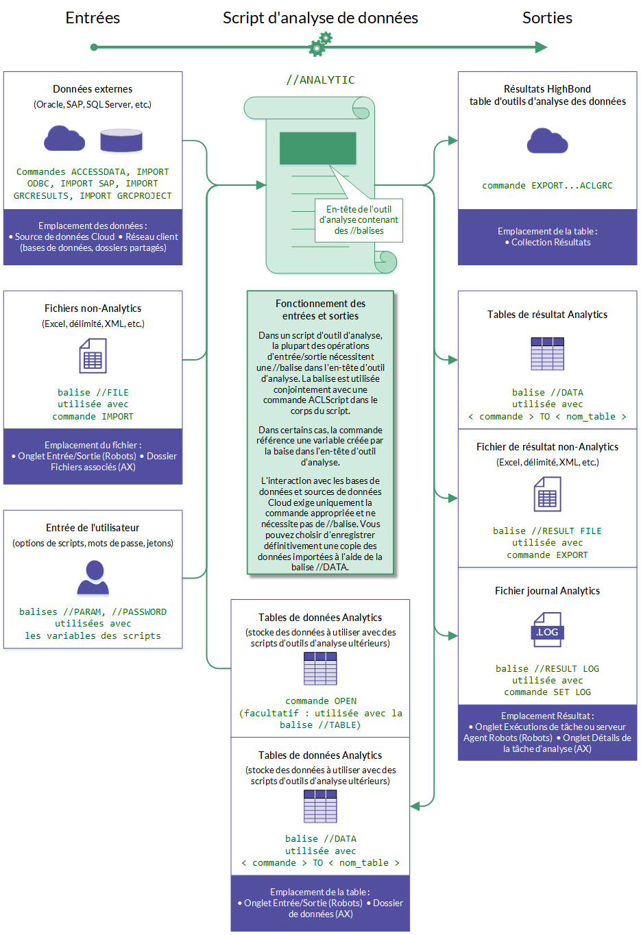 Le schéma ci-dessous illustre toutes les entrées et sorties possibles pour un script d'analyse. Chaque entrée ou sortie affiche :