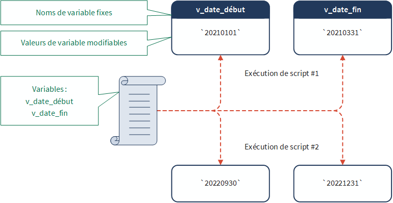 Dans l'exemple ci-dessous, une variable portant le nom v_date_début contient actuellement la valeur date `20210101` et une variable portant le nom v_date_fin contient actuellement la valeur date `20210331`.