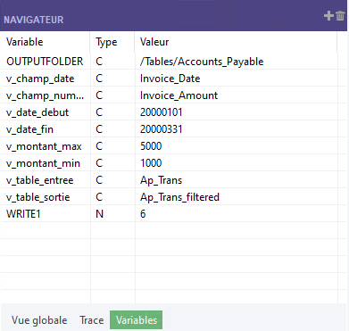 L'insertion de la commande DISPLAY VARIABLES à différents endroits dans un script vous permet de capturer l'état ponctuel des variables du projet.