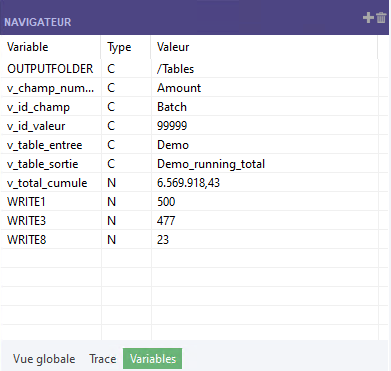 Les valeurs attribuées à v_id_valeur et v_total_cumulé sont continuellement mises à jour au fur et à mesure de la progression du script. L'onglet Variables affiche leurs valeurs finales avant la fin du script.