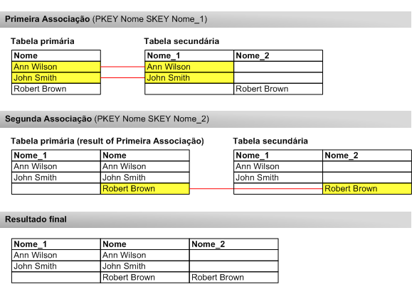 Para capturar todas as correspondências possíveis entre nomes, você precisa executar duas associações sucessivas, com cada associação usando somente um dos campos-chave na tabela secundária. A tabela de saída da primeira associação é usada como tabela primária para a segunda associação.