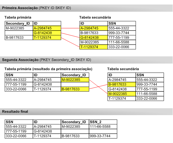 Para associar números de CPF a declarantes principais e secundários, você precisa executar duas associações sucessivas, com cada associação usando somente um dos campos-chave na tabela primária. A tabela de saída da primeira associação é usada como tabela primária para a segunda associação.