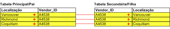 Se tabelas forem associadas ou relacionadas usando somente ID_fornecedor, registros de tabela secundária (ou filha) com qualquer item que não seja a primeira localidade listada não são incluídos na tabela associada (considerando uma associação de muitos para um) nem na tabela relacionada, e as localidades serão correspondidas de forma errada entre as tabelas.