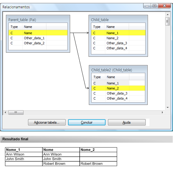 Você deseja usar nomes para associar ou relacionar duas tabelas. A tabela primária ou pai contém o campo Nome. No entanto, a tabela secundária ou filha contém dois nomes de campo diferentes: Nome_1 e Nome_2. Os nomes correspondentes da tabela secundária ou filha podem aparecer em um dos dois campos de nome.
