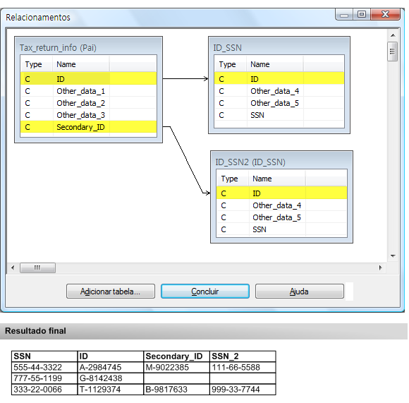 A tabela primária (ou pai) contém o campo ID com números de ID dos declarantes principais e o campo ID_secundário com números de ID para os declarantes secundários (cônjuges), quando aplicável. A tabela secundária (ou filha) contém um campo de ID com números de ID para todos. Você deseja produzir dados associados ou relacionados que associam números de CPF a declarantes principais e secundários de impostos.
