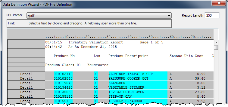 了解如何定义这些类型的文件的最佳方式是尝试定义 Analytics 附带的样本文件之一。“REPORT3.TXT” 比较容易定义。“Inventory.pdf”更富有挑战性。