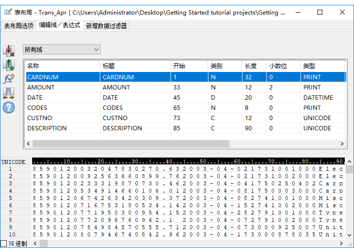 IMPORT EXCEL TO Trans_Apr_s "C:\Users\用户账户名称\Documents\ACL Data\Sample Data Files\Trans_Apr_s.fil" FROM "Trans_April.XLS" TABLE "Trans_Apr$" KEEPTITLE FIELD "CARDNUM" N WID 16 DEC 0 AS "" FIELD "AMOUNT" N WID 6 DEC 2 AS "" FIELD "DATE" D WID 10 PIC "YYYY-MM-DD" AS "" FIELD "CODES" N WID 4 DEC 0 AS "" FIELD "CUSTNO" C WID 6 AS "" FIELD "DESCRIPTION" C WID 45 AS ""