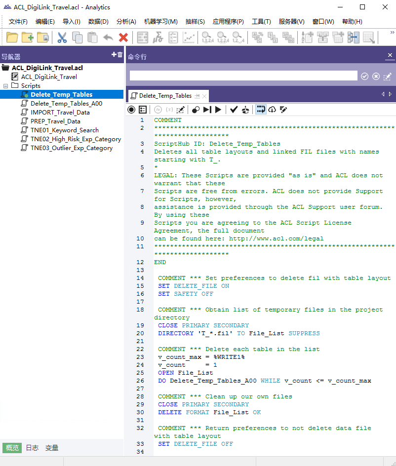 脚本被在导航器的概览选项卡中分别可视化。尽管脚本被分别可视化,但 Analytics 项目中的所有脚本都被包含在单个 Analytics 项目文件 (*.acl) 内。