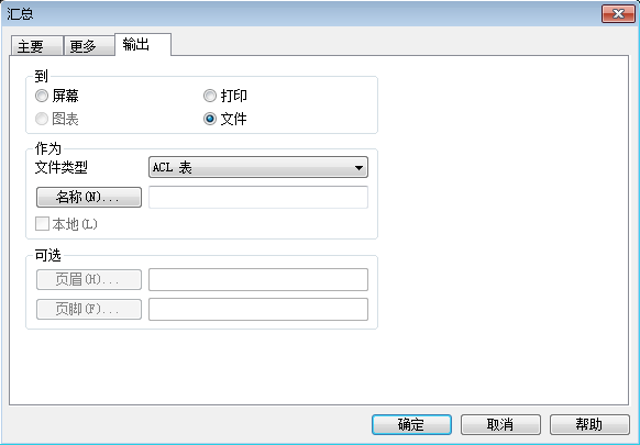 指定将包含输出结果的 Analytics 表或文本文件的名称和位置 出现在不具有输出选项卡的命令对话框中的主要选项卡上(作为到) |