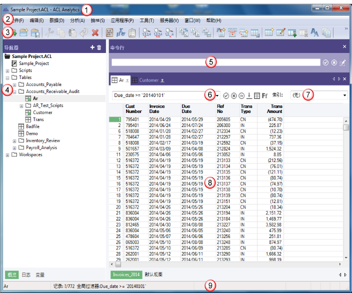 显示打开的 Analytics 项目的名称和 ACL for Windows 组件名称。 |